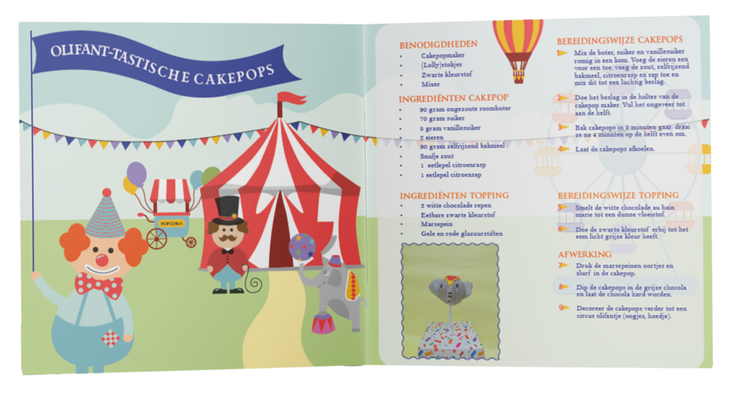 Voor deze opdracht heb ik een kinder kookboek ontworpen met het thema circus. Ik heb gewerkt met verschillende kleuren binnen het thema circus, grappige dieren en illustraties om de vrolijke sfeer van het circus te laten zien. De illustraties heb ik zelf gemaakt in Adobe Illustrator, verder heb ik de opmaak uitgewerkt in Indesign.