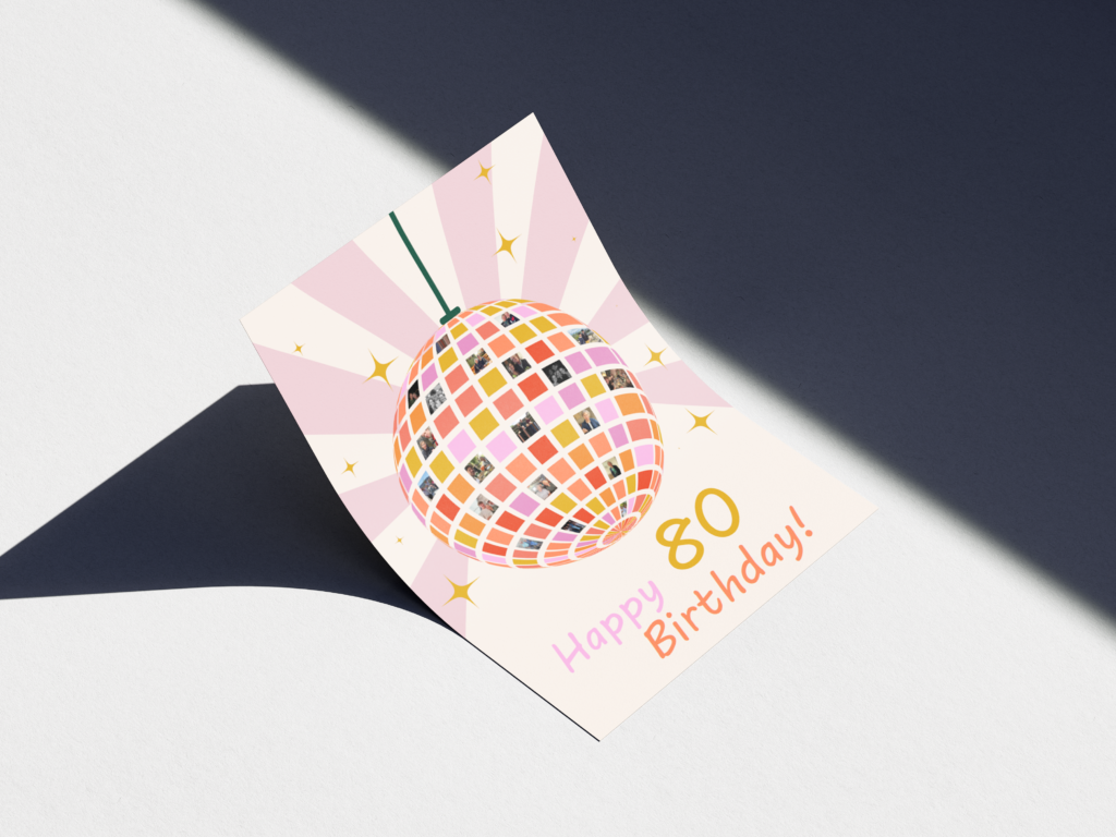 Voor de 80ste verjaardag van mijn oma wilde ik iets persoonlijks geven. Ik heb deze kaart in Illustrator gemaakt met een discobol. Ik sommige vakjes zitten foto’s van mijn oma. Een paar van vroeger, en een paar van nu.